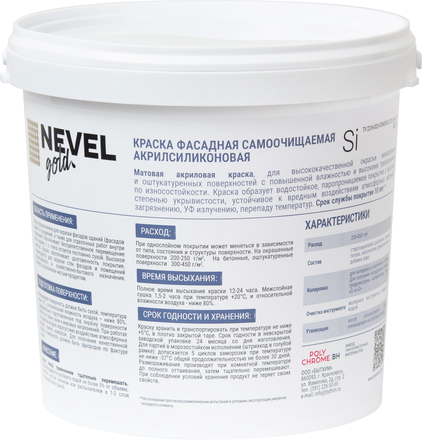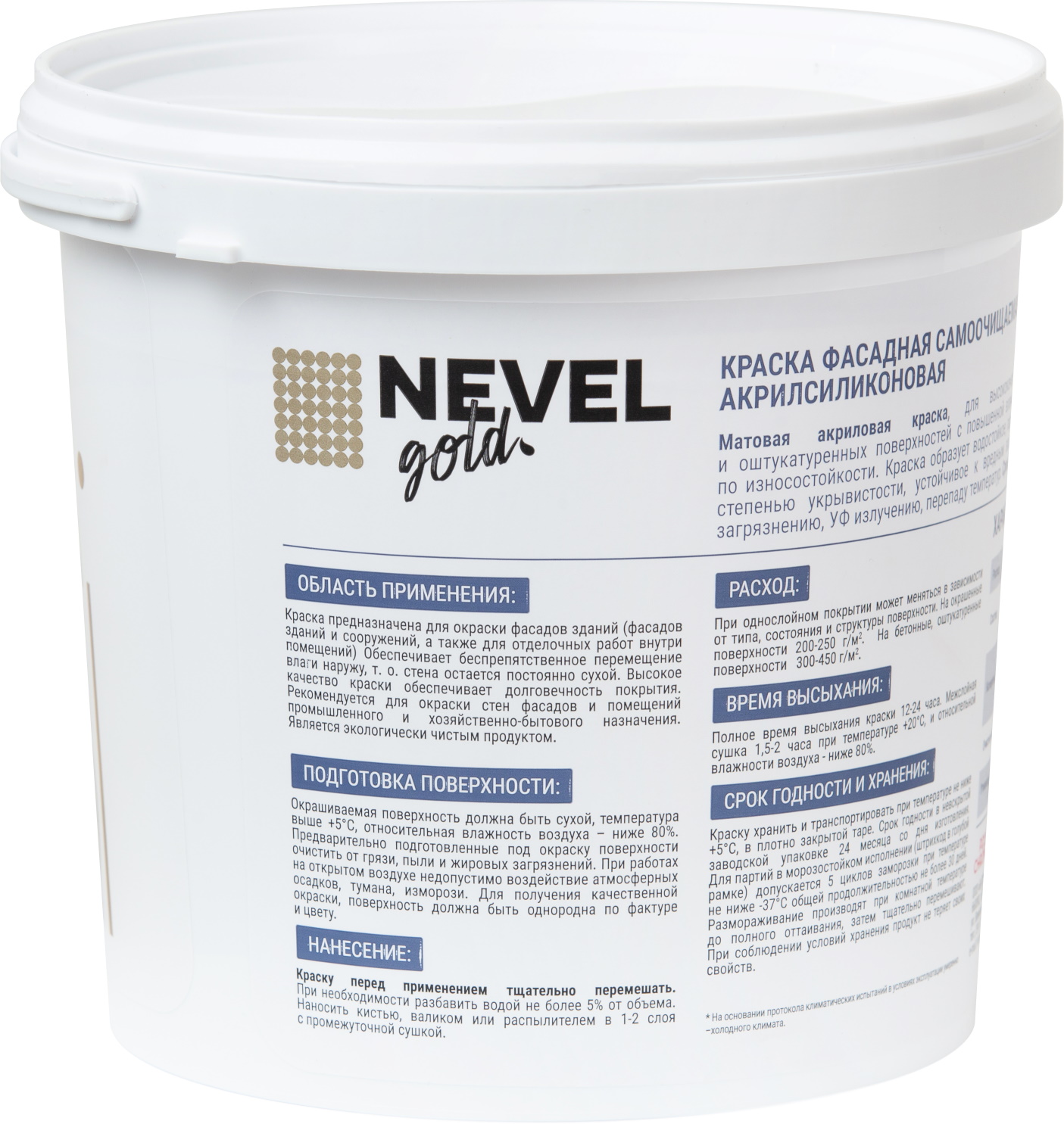 Бренд NEVEL GOLD АртикулОборудования1 W590 АртикулОборудования2 350M Страна производства Россия АртикулОборудования3 МР-1600-2 Тип краски На водной основе Предназначен для Для фасадов зданий Уход Моющаяся Межслойная сушка (ч) 1 - 2 Время полного высыхания (ч) 12 - 24 Тип помещения Фасад здания Блеск Матовый Назначение Для стен Расход г/м2 200 - 450 Тип упаковки Банка Разбавитель Вода Внешний вид Гладкая Тип продукта Краска Эффект Гладкий Срок годности (в месяцах) 24 -