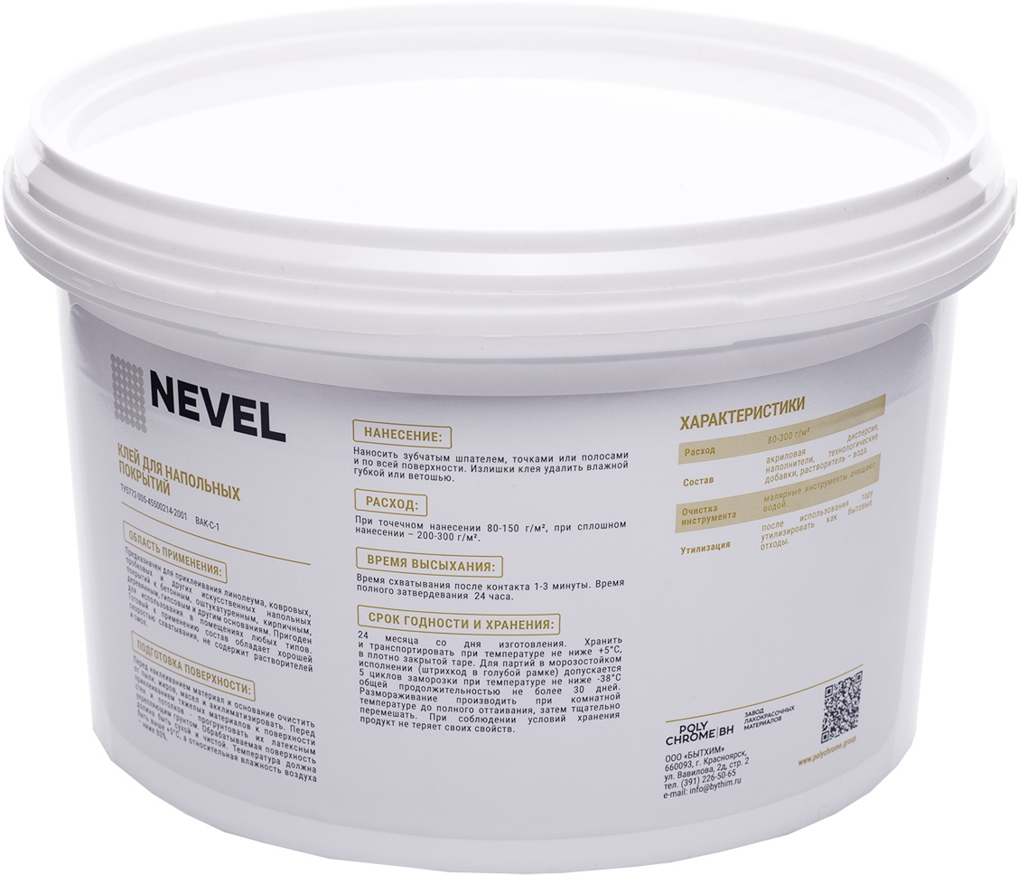 Время схватывания 1 - 3 мин Бренд NEVEL Упаковка Ведро Объем 2,7 кг Место использования Для внутренних работ Страна производства Россия Термостойкость -37 +5 Основа Акриловая дисперсия Тип продукта Клей Срок годности (м) 24 Материалы для склеивания Линолеума, ковровых, пробковых и др. напольных покрытий. -