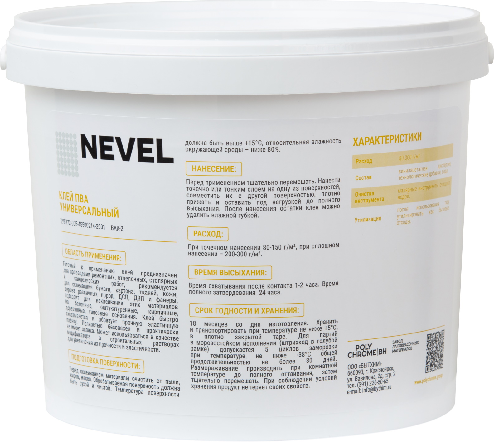 Время схватывания 1 - 2 часа Бренд NEVEL Упаковка Ведро Объем 3 кг Место использования Для внутренних работ Страна производства Россия Термостойкость -37 +5 Основа ПВА дисперсия Тип продукта Клей Срок годности (м) 18 Материалы для склеивания Бумаги, картона, тканей, кожи, дерева, ДСП, ДВП, фанеры и др. -