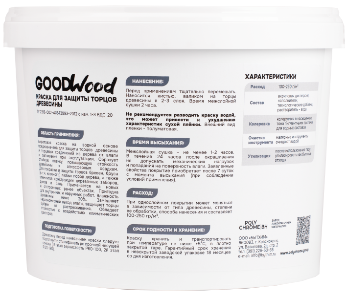 Бренд GOODWOOD Страна производства Россия Тип Товара Новинка Тип краски На акриловой основе Предназначен для Для внутренних и наружных работ Уход Моющаяся Межслойная сушка (ч) 2 часа Время полного высыхания (ч) 24 Тип помещения Для всех типов помещений Блеск Полуматовый Назначение По дереву Расход г/м2 100 - 250 Тип упаковки Ведро Разбавитель Вода Внешний вид Гладкая Тип продукта Краска Эффект Гладкий Срок годности (в месяцах) 18 -