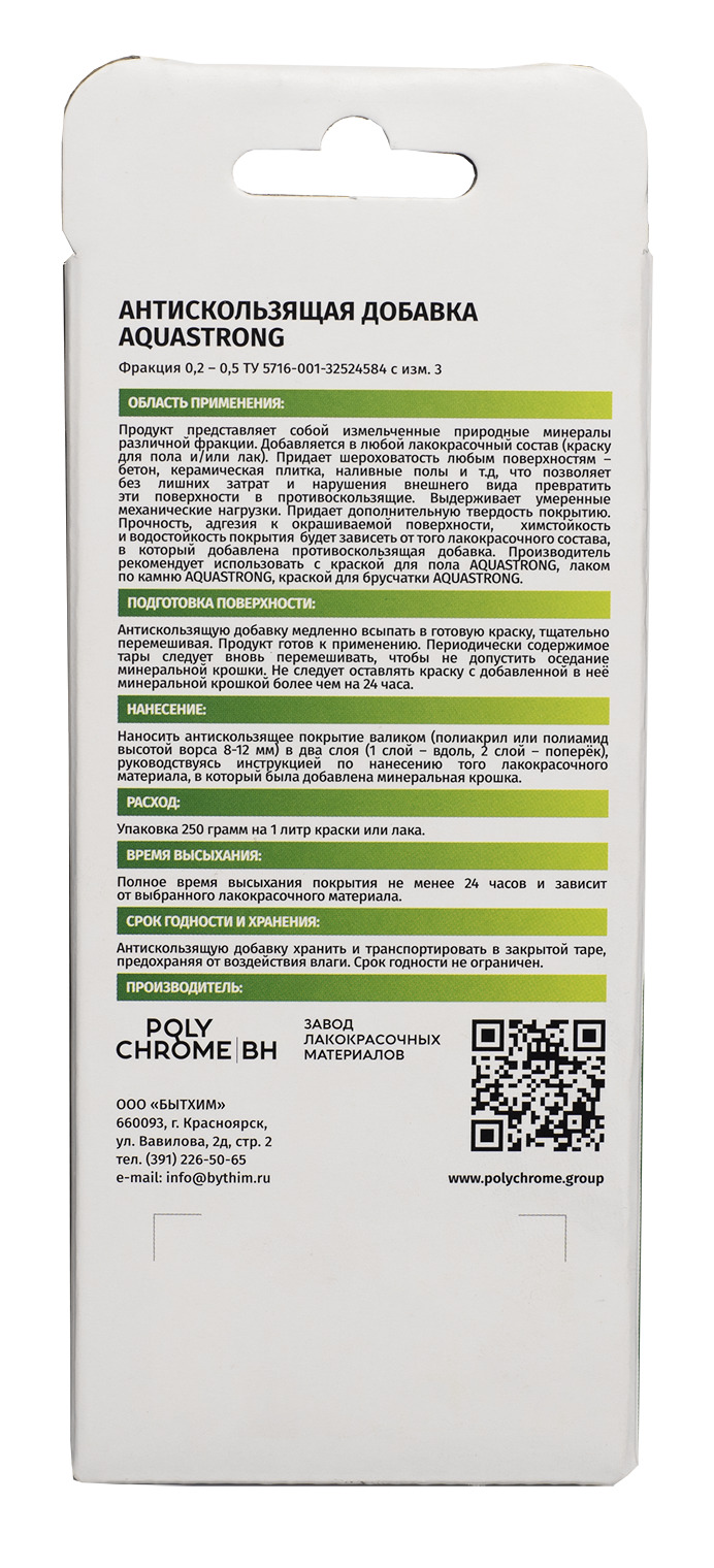 Прочность, адгезия к окрашиваемой поверхности химстойкость и водостойкость покрытия будет зависеть от лакокрасочного состава, в который добавлена антискользящая добавка. Продукт совместим с любыми лакокрасочными материалами для пола, в том числе и на органической основе. Производитель рекомендует использовать краску для пола Aquastrong и лак по камню Aquastrong.