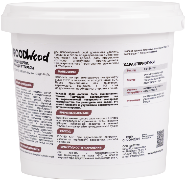 Бренд GOODWOOD Страна производства Россия Тип Товара Новинка Тип краски Синтетические добавки Предназначен для Для наружных работ Уход Влажная уборка Межслойная сушка (ч) 1 - 3 Время полного высыхания (ч) 24 Тип помещения Фасад здания Блеск Глянцевый Назначение По дереву Расход г/м2 100 - 150 Тип упаковки Банка Внешний вид Гладкая Тип продукта Лак Эффект Глянцевый Срок годности (в месяцах) 24 -