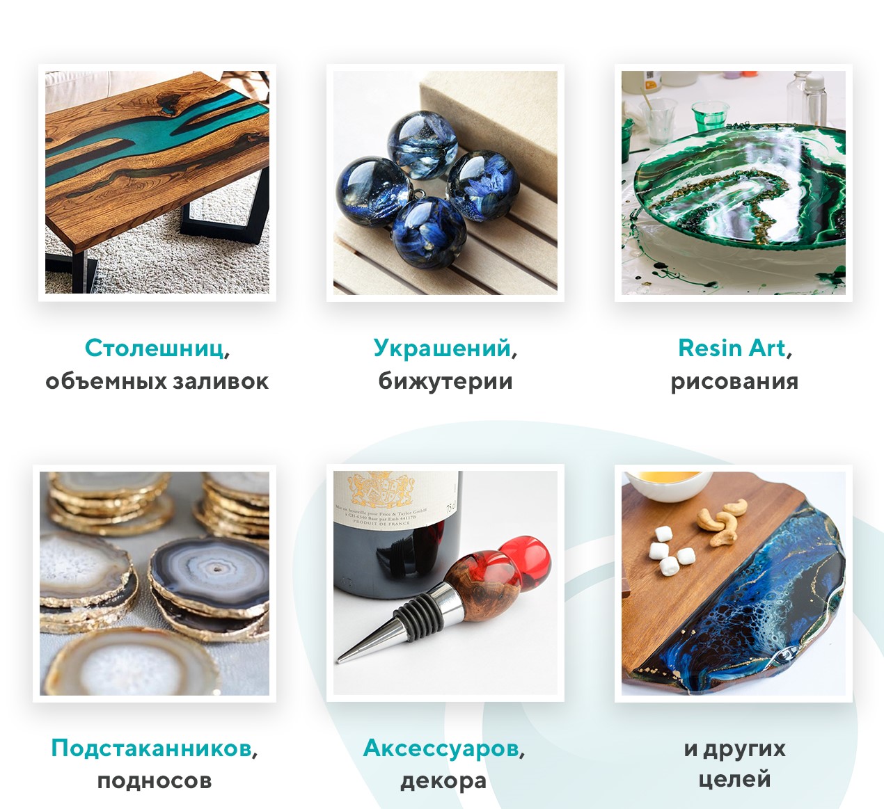 Универсальная эпоксидная смола, подходящая для различных творческих и ремонтных целей: ювелирных изделий, столешниц, грунтования, декорирования, рисования картин (Resin Art), в качестве клея и др.