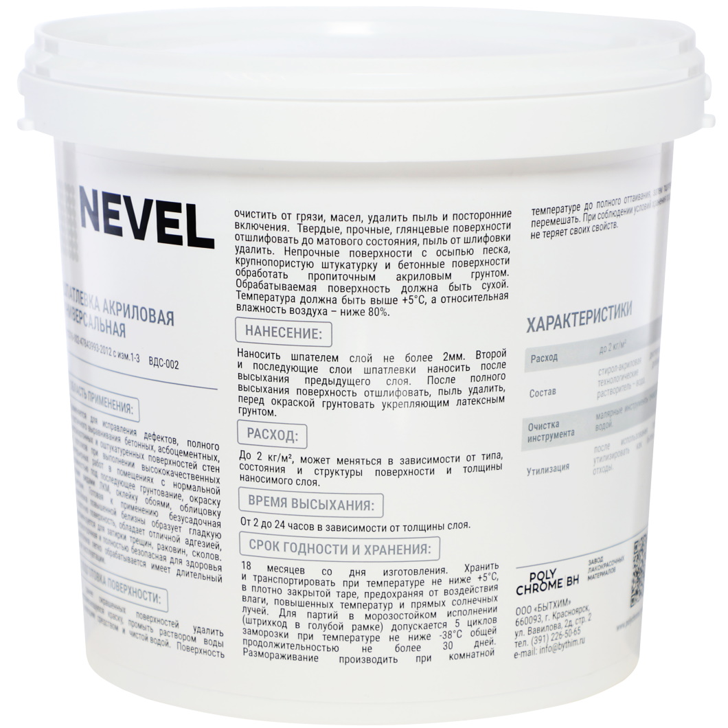 Бренд NEVEL Страна производства Россия Запах Без запаха Предназначен для Для стен и потолков Межслойная сушка (ч) 2 - 24 Время полного высыхания (ч) 24 Тип помещения Для всех типов помещений Блеск Матовый Назначение Для стен и потолков Расход г/м2 2000 Тип упаковки Банка Разбавитель Вода Внешний вид Гладкая Тип продукта Шпатлёвка Эффект Гладкий Срок годности (в месяцах) 18 -