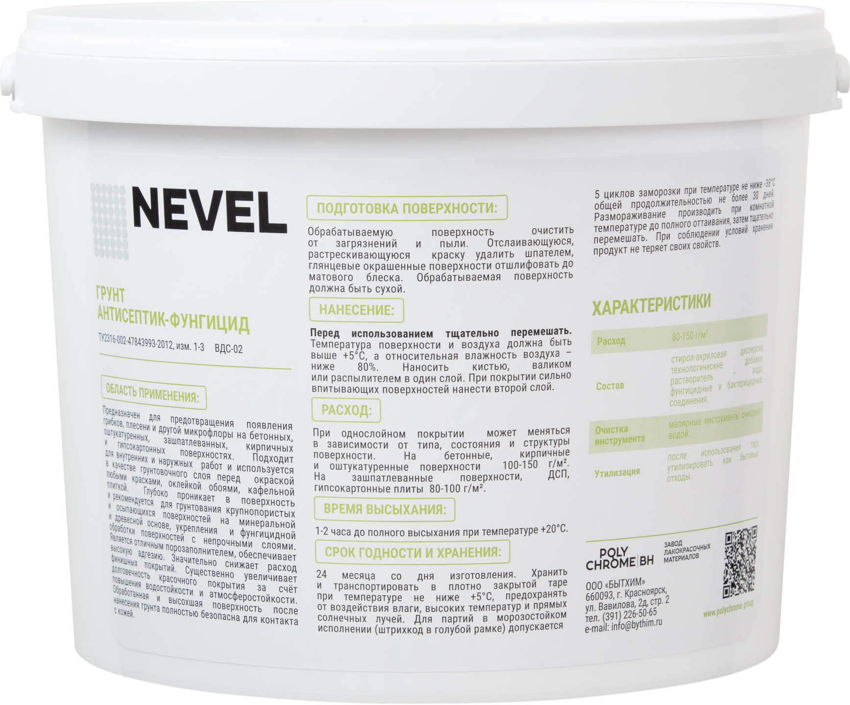 Бренд NEVEL Страна производства Россия Запах Без запаха Тип краски На водной основе Предназначен для Для стен и потолков Межслойная сушка (ч) 1 - 2 Время полного высыхания (ч) 12 Тип помещения Для всех типов помещений Блеск Матовый Назначение Для стен и потолков Расход г/м2 70 - 150 Тип упаковки Канистра Разбавитель Вода Внешний вид Гладкая Тип продукта Грунт Эффект Гладкий Срок годности (в месяцах) 24 -
