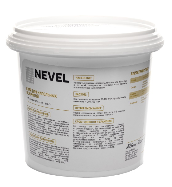 Время схватывания 1 - 3 мин Бренд NEVEL Упаковка Ведро Объем 1,3 кг Место использования Для внутренних работ Страна производства Россия Термостойкость -37 +5 Основа Акриловая дисперсия Тип продукта Клей Срок годности (м) 24 Материалы для склеивания Линолеума, ковровых, пробковых и др. напольных покрытий. -