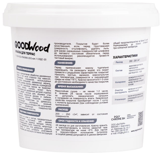 Бренд GOODWOOD АртикулОборудования1 W590 АртикулОборудования2 350M Страна производства Россия АртикулОборудования3 МР-1600-2 Тип Товара Новинка Предназначен для Для деревянных полов Уход Влажная уборка Межслойная сушка (ч) 1 - 2 Время полного высыхания (ч) 24 Тип помещения Для всех типов помещений Блеск Глянцевый Назначение По дереву Расход г/м2 200 - 250 Тип упаковки Банка Разбавитель Вода Внешний вид Гладкая Тип продукта Краска Срок годности (в месяцах) 24 -