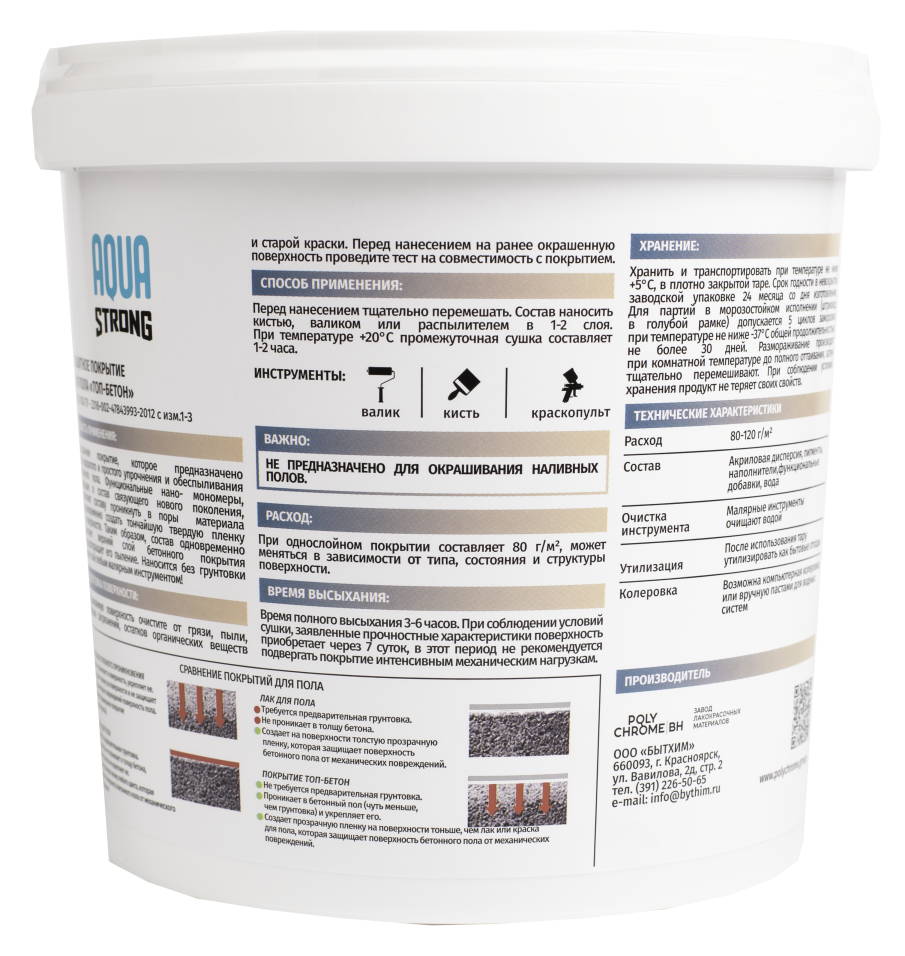 Бренд AQUASTRONG Страна производства Россия Тип Товара Новинка Тип краски На водной основе Предназначен для Для пола Уход Моющаяся Межслойная сушка (ч) 12 - 24 Время полного высыхания (ч) 24 Тип помещения Для всех типов помещений Блеск Матовый Назначение Для пола Расход г/м2 90 - 300 Тип упаковки Банка Внешний вид Гладкая Тип продукта Краска Эффект Гладкий Срок годности (в месяцах) 18 -