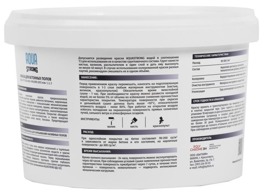 Бренд AQUASTRONG АртикулОборудования1 W590 АртикулОборудования2 350M Страна производства Россия АртикулОборудования3 МР-1600-2 Запах Без запаха Тип краски На водной основе Предназначен для Для пола Уход Моющаяся Межслойная сушка (ч) 12 - 24 Время полного высыхания (ч) 24 Тип помещения Для всех типов помещений Блеск Матовый Назначение Для пола Расход г/м2 90 - 300 Тип упаковки Банка Внешний вид Гладкая Тип продукта Краска Эффект Гладкий Срок годности (в месяцах) 18 -
