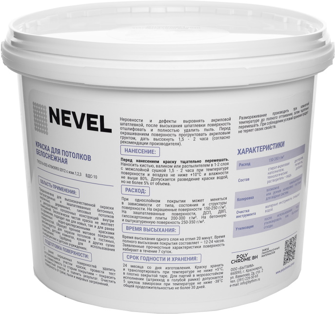Бренд NEVEL АртикулОборудования1 W590 АртикулОборудования2 350M Страна производства Россия АртикулОборудования3 МР-1600-2 Запах Без запаха Тип краски На водной основе Предназначен для Для потолков Уход Не моющаяся Межслойная сушка (ч) 1,5 - 2 Время полного высыхания (ч) 12 - 24 Тип помещения Для всех типов помещений Блеск Матовый Назначение Для потолков Расход г/м2 150 - 400 Тип упаковки Банка Разбавитель Вода Внешний вид Гладкая Тип продукта Краска Эффект Гладкий Срок годности (в месяцах) 18 -