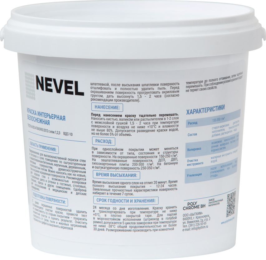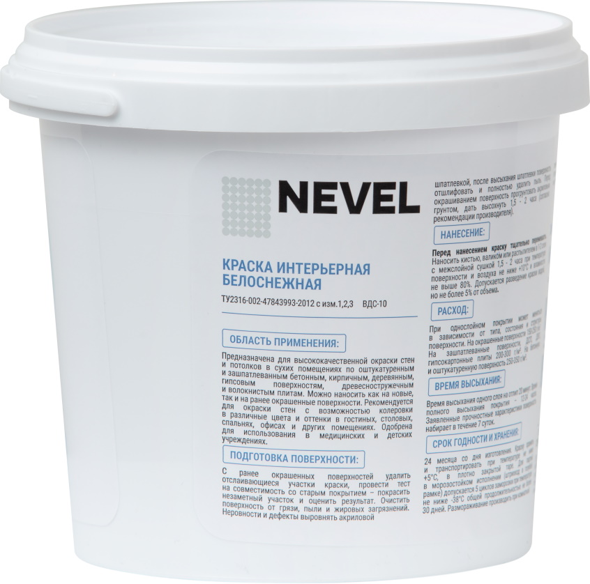 Бренд NEVEL АртикулОборудования1 W590 АртикулОборудования2 350M Страна производства Россия АртикулОборудования3 МР-1600-2 Запах Без запаха Тип краски На водной основе Предназначен для Для стен и потолков Уход С помощью влажной губки Межслойная сушка (ч) 1,5 - 2 Время полного высыхания (ч) 12 - 24 Тип помещения Для всех типов помещений Блеск Матовый Назначение Для стен и потолков Расход г/м2 150 - 400 Тип упаковки Банка Разбавитель Вода Внешний вид Гладкая Тип продукта Краска Эффект Гладкий Срок годности (в месяцах) 24 -