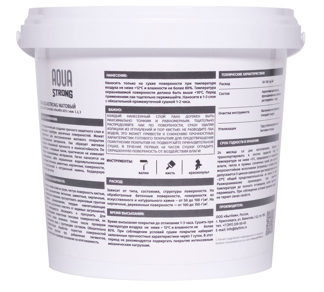 Бренд AQUASTRONG Страна производства Россия Запах Без запаха Тип краски На водной основе Предназначен для Для стен и потолков Уход Моющаяся Межслойная сушка (ч) 1 - 2 Время полного высыхания (ч) 12 - 24 Тип помещения Для всех типов помещений Блеск Матовый Назначение Универсальная Расход г/м2 50 - 150 Тип упаковки Банка Разбавитель Вода Внешний вид Гладкая Тип продукта Лак Эффект Матовый Срок годности (в месяцах) 24 -