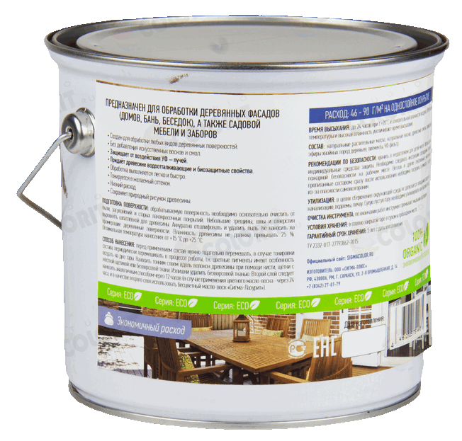 Защитное покрытие для фасадов и внешних стен срубов, предназначен для обработки деревяных фасадов, а также садовой мебели и заборов. -