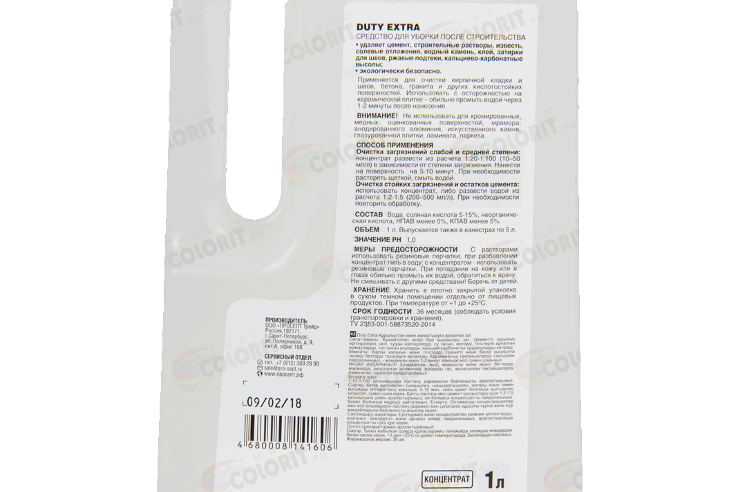Средство для удаления строительных растворов DutyExtra суперконцентрат обладает высоким очищающим действием. Удаляет стойкие загрязнения (строительные растворы, цемент, известь, солевые отложения, водный камень, клей, затирки для швов, ржавые подтёки, кальциево-карбонатные высолы.